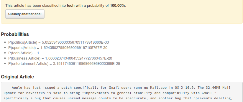 Long ago, I worked on a news article classifier with Naive Bayes and TF-IDF.