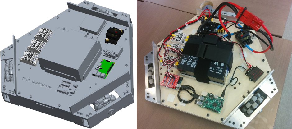 iTAD Omni is an omnidirectional robotics platform measuring 2 feet across capable of driving 120lb of weight. Originally developed for the iTAD fourth year project, the system now serves as a robotics research platform in Carleton University's Advanced Biomechatronics and Locomotion Laboratory.