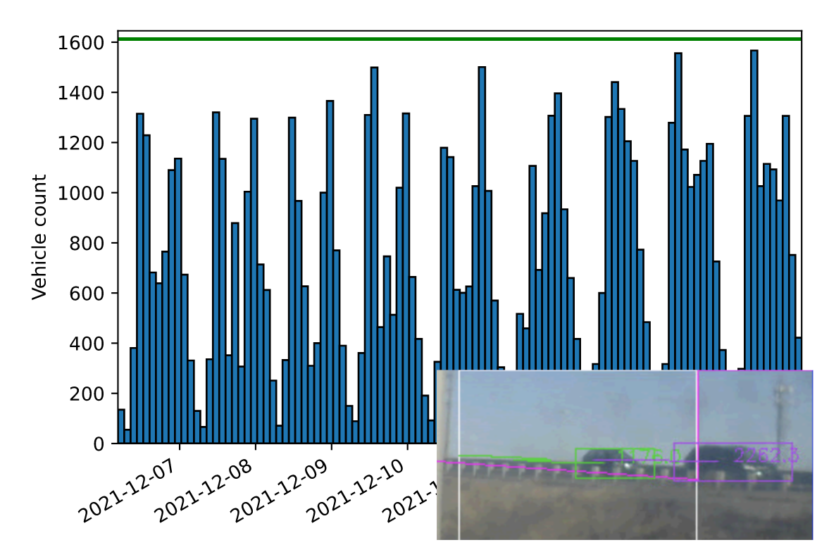At the start of the COVID19 pandemic, I setup a camera at my house that counted the cars entering the highway. The filtering and tracking of cars are performed via a custom algorithm written with OpenCV. During the initial weeks of the lockdown, the system logged a 30% decrease in traffic. A second version of the system was put in place later in the year, and has now continuously recorded data for almost 12 months.